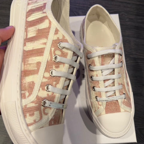Grace meets modern craftsmanship in these exquisite women’s sneakers, crafted in pristine white with soft pink lettering for a touch of feminine sophistication. The oblique embroidered material lends an air of refined artistry, creating a subtle play of texture and light. Designed for the woman who moves with confidence and style, these sneakers blend couture-inspired elegance with everyday comfort. From the city streets to weekend escapes, they embody effortless luxury — where timeless design meets contemporary charm.