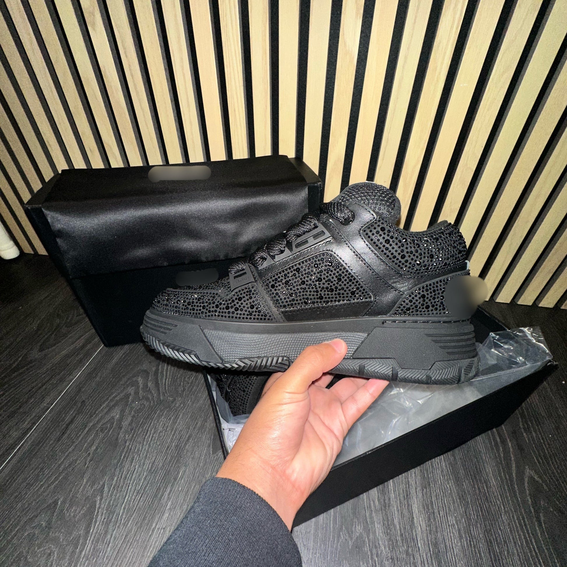 “Refined yet daring, these black sneakers are elevated with meticulously placed stone embellishments that catch the light with every step. Crafted for the modern tastemaker, they fuse contemporary comfort with a touch of opulence—an effortless statement piece that transitions seamlessly from day to night.”